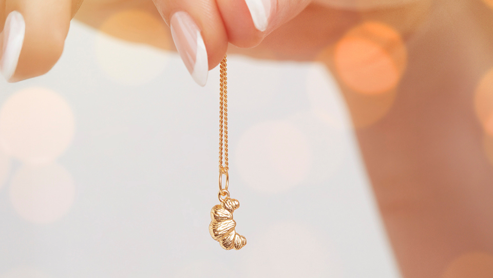 hand holding dainty croissant necklace