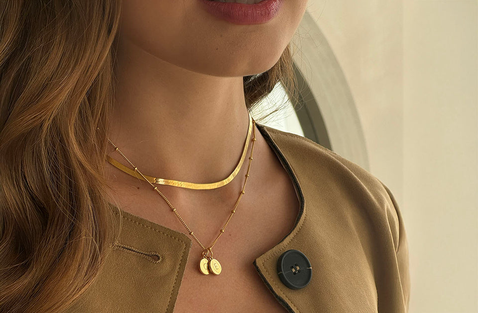 Woman wearing gold mothers day gift necklace with discs..
